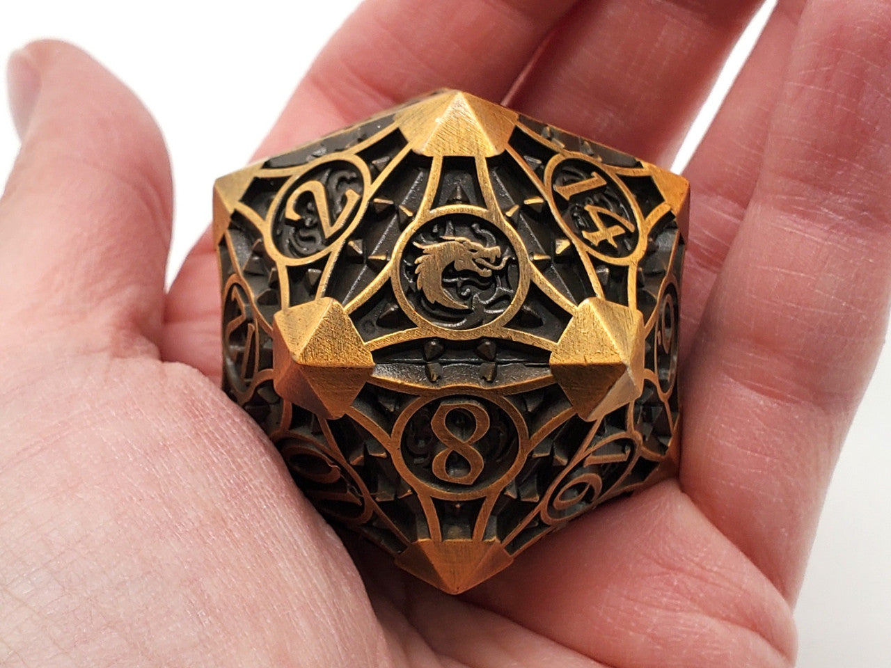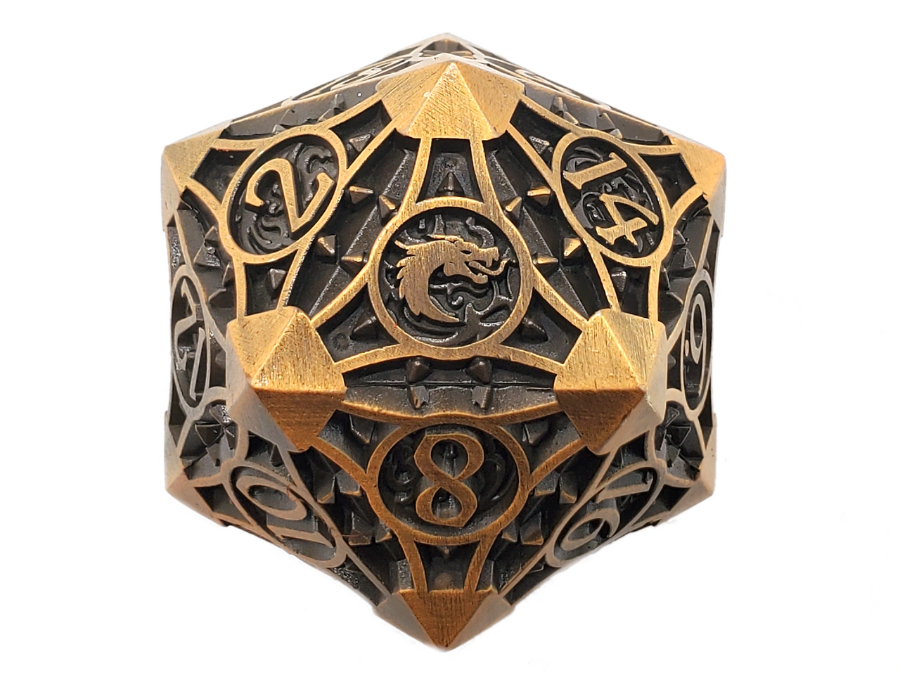 Boasting a satisfying weight that ensures a stable roll every time. This d20 is Finished with a dual-tone effect, the recessed areas present a deep, aged patina that accentuates the raised numerals and borders in a lustrous Gold, offering excellent contrast and visibility. This d20 not only serves as a reliable tool for gameplay but also as a statement piece that exudes a sense of ancient mystique and sophistication. Whether used in crucial campaign moments or displayed as a part of a dice collection, this dice is sure to be a treasured addition for any discerning gamer or collector.